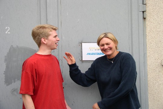 Regisseur Christoph Hees begrüßt Denise Crosby vor der Studio-Tür