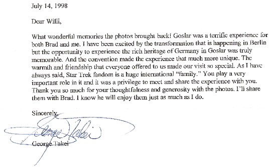 Diesen Brief schrieb mir George Takei (Mr. Sulu, TOS)